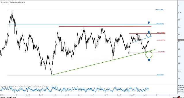 W efekcie droga do dalszego umocnienia dolara względem złotego stoi przed stroną popytową otworem. Kolejne docelowe zasięgi dla takiego scenariusza rozciągają się pomiędzy 3,7825 a 3,8080 (patrz wykres powyżej). Nie można wykluczyć, że i te bariery zostaną pokonane, a wówczas czekałby nas test górnego ograniczenia średnioterminowego trendu bocznego, tj. 3,8550. Taki wariant jest na obecnym etapie preferowany, ale dopiero wybicie ze wspomnianej kilkumiesięcznej konsolidacji powie nam coś więcej na temat kierunku trendu w szerszym horyzoncie.