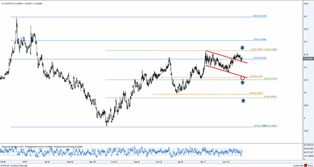 Zgoła odmiennie przedstawia się sytuacja na rynku eurozłotego. Jeszcze wczoraj wydawało się, że podaż zdoła zepchnąć kurs EURPLN z powrotem do wnętrza średnioterminowego trendu, z którego wybicie nastąpiło pod koniec poprzedniego miesiąca. Niemniej jednak w rejonie górnego ograniczenia wspomnianej konsolidacji uaktywniła się strona popytowa. Dopóki kurs analizowanej pary będzie utrzymywał się powyżej 4,2220, preferowanym wariantem pozostanie dalsze umocnienia wspólnej waluty względem złotego. Pierwszych potencjalnych zasięgów dla takiego scenariusza szukałbym w rejonie 4,2660 (patrz wykres powyżej).